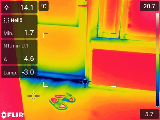 • Lämpökameraa hyödynnetään myös muissa mittauksissa, kartoituksissa ja selvityksissä – esimerkiksi mahdollisten kylmäsiltojen, vuotojen tai kastuneen betonin paikantamisessa